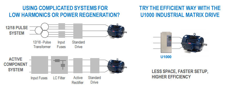 Yaskawa has introduced the U1000 Industrial Matrix Drive, it’s most efficient drive ever. The U1000 is second to none when it comes to power quality and energy savings. Enjoy extremely low harmonic distortion and regeneration in a compact design without the need for additional components. Unlike conventional drives, Yaskawa’s matrix technology creates a variable output by switching directly from the input power (no DC bus). Make measurable efficiency gains while experiencing the outstanding performance of a Yaskawa industrial drive.