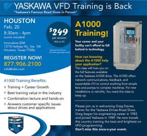 Yaskawa VFD training coming to Houston Monday, Feb. 20. Class will be at the Innovative-IDM training facility near Beltway and 249. One day class. Call 1-877-906-2100 or email [email protected] to sign up today. Seats are limited to 15.