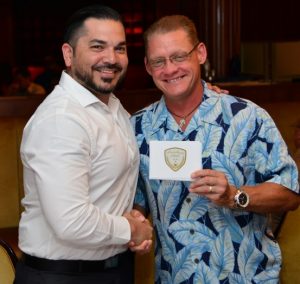 Jesse Simental accepts congratulations from Gene Grey at sea on a President’s Club trip in 2017.