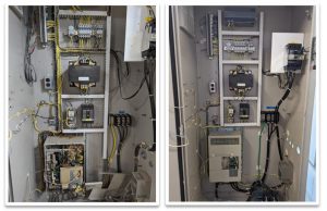 WE REPAIR INDUSTRIAL DRIVES: On the left is a prefab configured control panel that was sent to us for drive repair. On the right is pictured the same panel after we refurbished it.