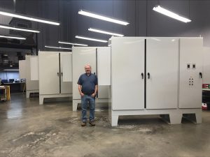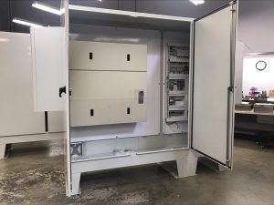 These are 4 x 1200A Drive Panels. Last week, our Houston manufacturing team laid all four of these massive custom N3R enclosures on their backs and stuffed each with a 1200A Yaskawa A1000 drives and a pre-wired back panel.  Once upright, two AC units totaling more than 3 tons were installed onto each panel.
