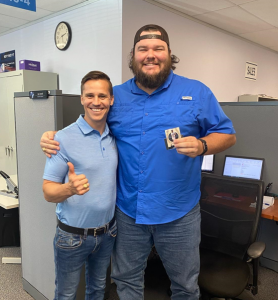 Houston customer service pro Jay Arnold is shown holding his newly acquired Fred “Crime Dog” McGriff card. Arnold took a bite out of crime by outing fraudulent information on a submitted credit application. Houston sales leader Braden Morris presented the former Texas A&M defensive end with his rewards, which included an Amazon gift card.